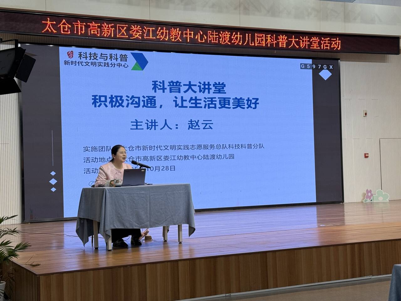 为搭建家园沟通的坚实桥梁,共同促进小班幼儿的健康成长,太仓市高新区娄江幼教中心陆渡幼儿园于2025年10月28日上午在多功能厅特邀家庭教育名师赵云老师来园开展以“积极沟通,让生活更美好”为主题的科普讲座活动。