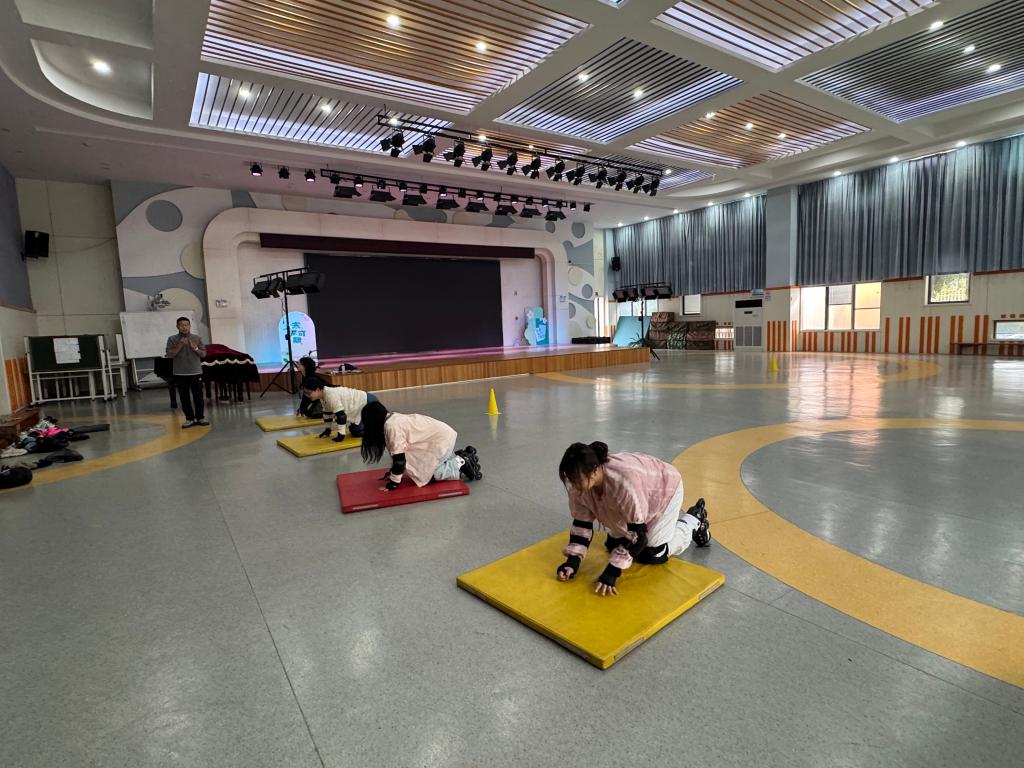 活动分两阶段有序开展。10月22日、24日为基础奠基阶段,先聚焦理论讲授,重点分享轮滑价值与安全案例,同时演示轮滑鞋、护具的正确穿戴方法。实操环节中,教师们先在软垫上练习轮滑预备式、原地踏步,反复打磨安全摔倒与起立的标准动作;随后进入平滑场地,通过扶墙复习姿势、横向移动感受轮子滚动、推墙滑行体验等方式克服恐惧,还借助“扶墙开火车”游戏强化基础技能,最后初步学习葫芦步动作分解与扶墙蹬腿练习,培训师全程逐个观察纠正,确保动作规范。10月30日、31日为进阶应用阶段,活动以集体复习安全摔倒和预备式拉开序幕。技能提升环节,教师们集中练习葫芦步滑行,在教练一对一指导下攻克难点,通过“比比谁的葫芦圆”游戏巩固效果,同时学习身体倾斜转弯的简单技巧。教学研讨中,大家围绕“幼儿教学与成人学习的差异” 展开交流,分享如何将摔倒转化为趣味游戏。