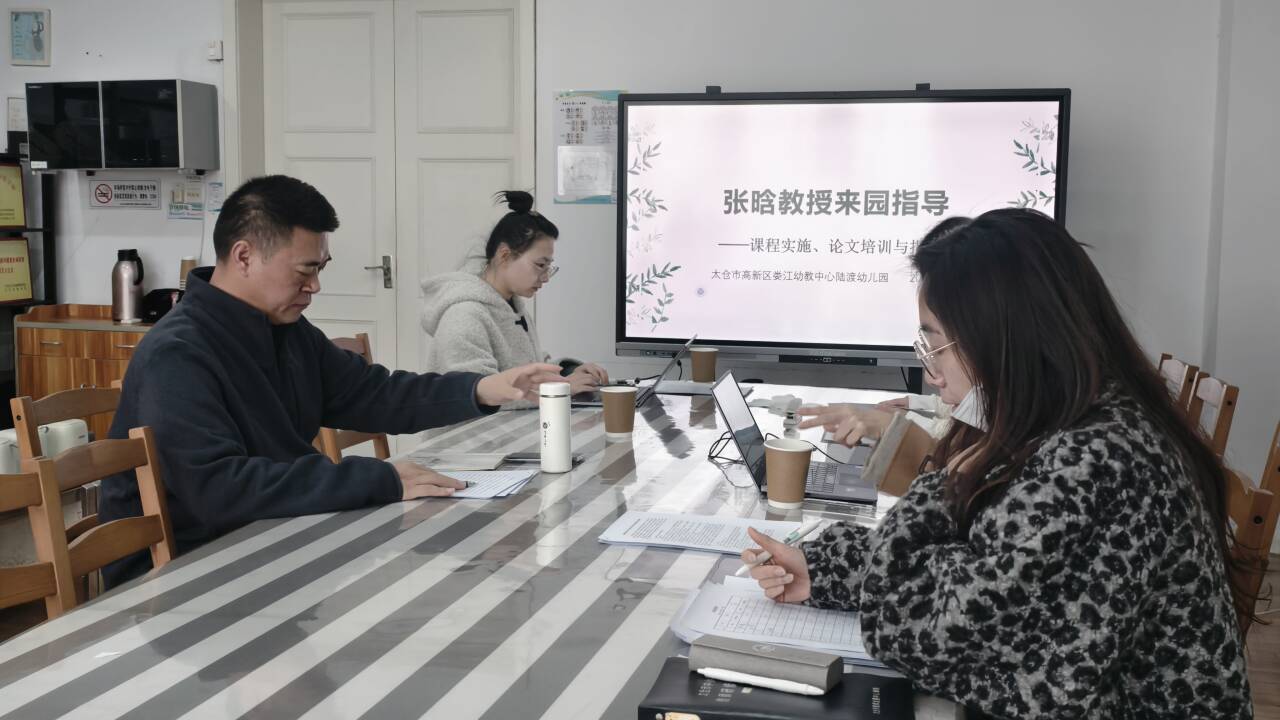 活动由陆渡幼儿园园长李燕华主持,娄江幼教中心主任沈英、业务园长许瑾、程娴及全体教师参与。培训以“专家引领+互动研讨”的形式展开。上午,李燕华园长首先就当前修改与优化的课程实施报告进行了重点汇报。随后,张晗教授结合报告内容,进行了专业点评与思路引导,帮助教师团队厘清研究方向,明确实施重点。下午,教师团队分别就课程实施相关论文进行汇报,张教授逐篇进行点对点指导,提出具体修改建议,助力教师凝练论文核心与标题。在互动交流环节,教师们结合专家意见,共同梳理优化思路,明确下一阶段的课程实施方向。