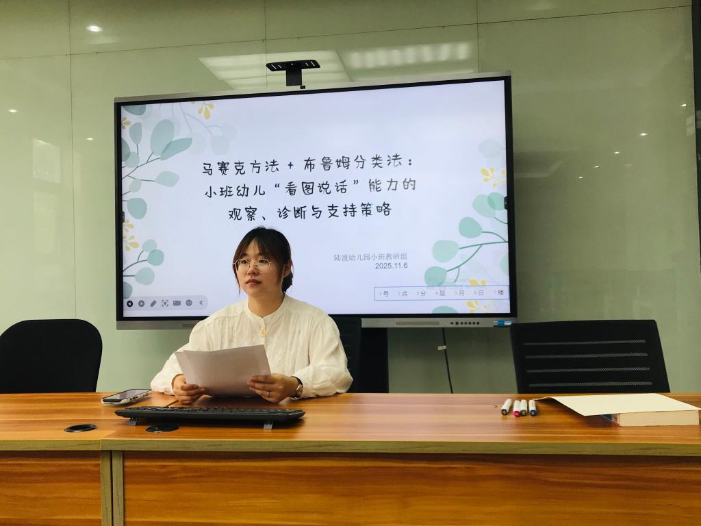 陆渡幼儿园小班组教研组于2025年11月6日12:10-14:00在101会议室开展依托马赛克方法与布鲁姆分类法,提升小班幼儿“看图说话”能力观察指导能力为主题的教研活动,本次活动聚焦小班幼儿语言发展特点,旨在通过创新教研方法,破解教师在幼儿 “看图说话” 指导中的难点,为幼儿语言能力的早期发展筑牢基础。由黄书慧老师主持,全体小班组教师参与。