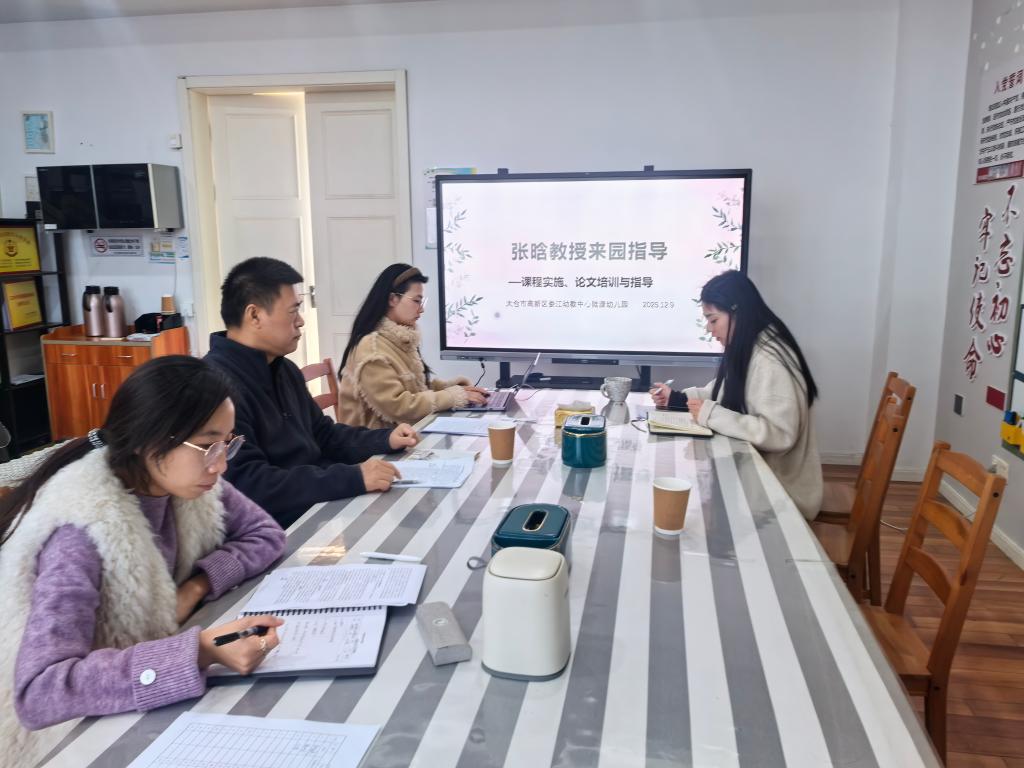 2025年12月9日,太仓市高新区娄江幼教中心陆渡幼儿园在园内102会议室组织开展了课程实施指导培训活动。本次活动特邀苏州幼儿师范高等专科学校张晗教授来园进行专业指导,旨在进一步提升教师论文撰写与课程反思能力,推动课程建设与教学研究的深度融合。活动由陆渡幼儿园园长李燕华主持,娄江幼教中心主任沈英、业务园长许瑾、程娴及全体教师共同参与。培训以“专家引领+分组研讨+个性化指导”的形式展开。