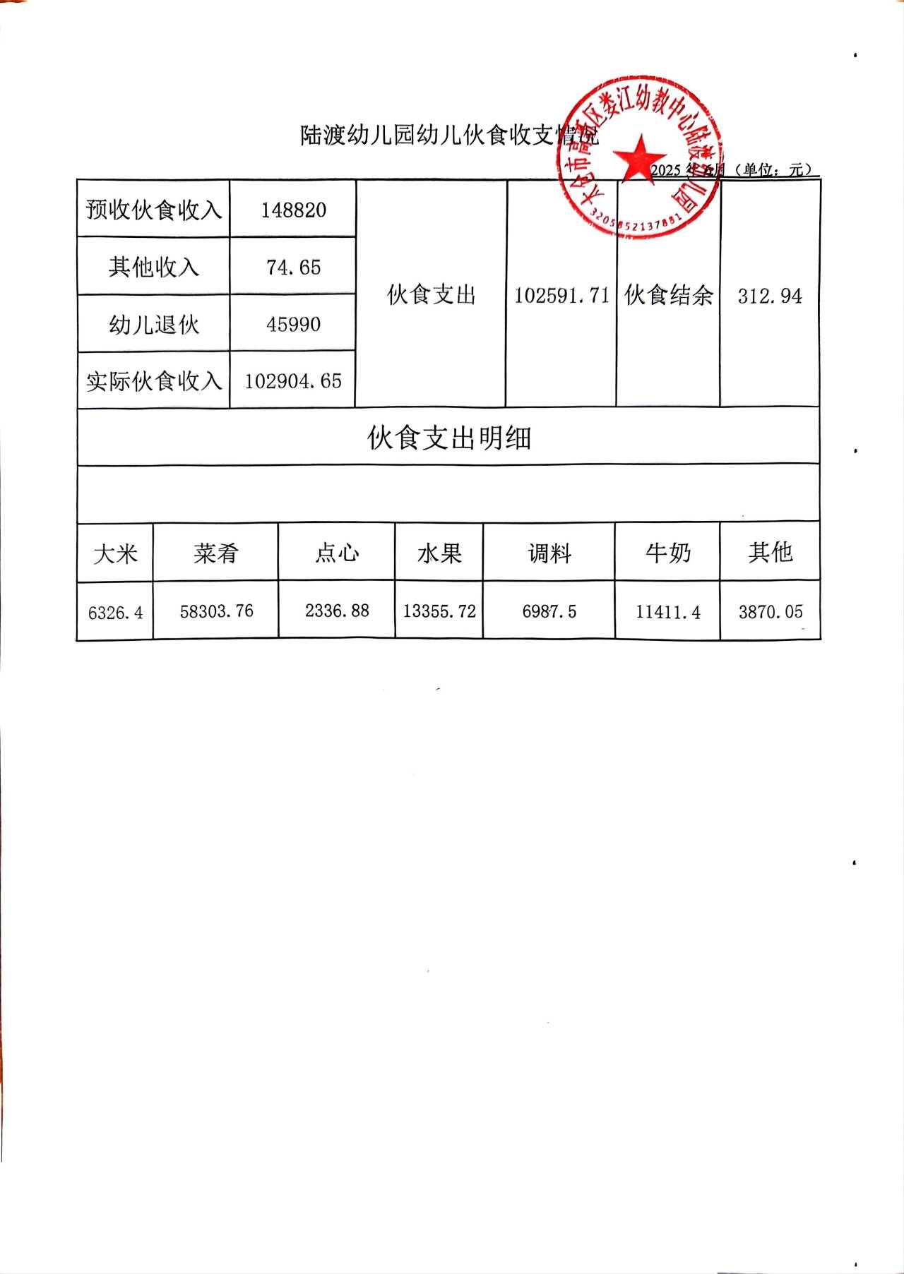 陆渡幼儿园幼儿伙食收支情况(6月份)