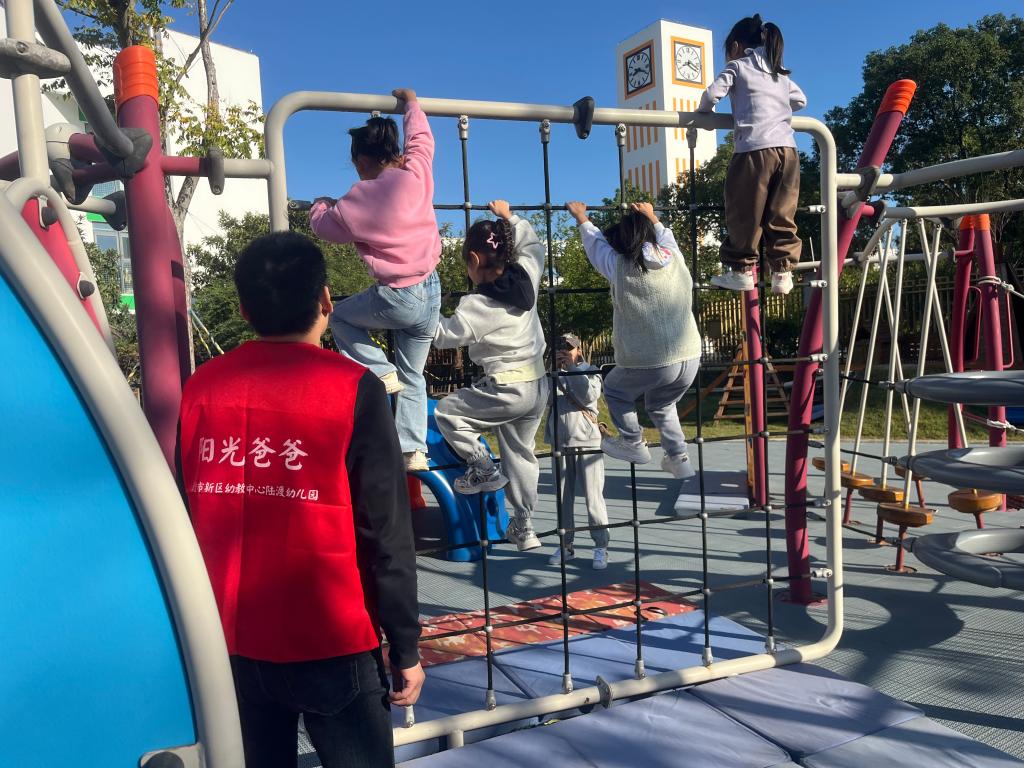 今天,阳光爸爸来到大9班,和我们一起攀爬,在爸爸的护导下,我们勇敢地爬到了最高处。